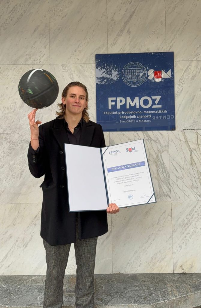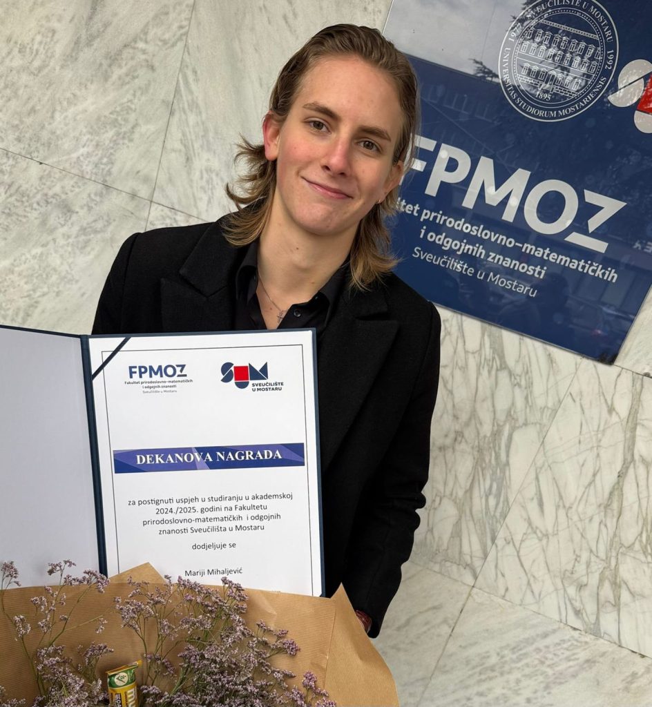 S ponosom ističemo da je bivša učenica Gimnazije Livno, Marija Mihaljević, jučer na svečanoj dodjeli na Fakultetu prirodoslovno-matematičkih i odgojnih znanosti Sveučilišta u Mostaru primila dekanovu nagradu.