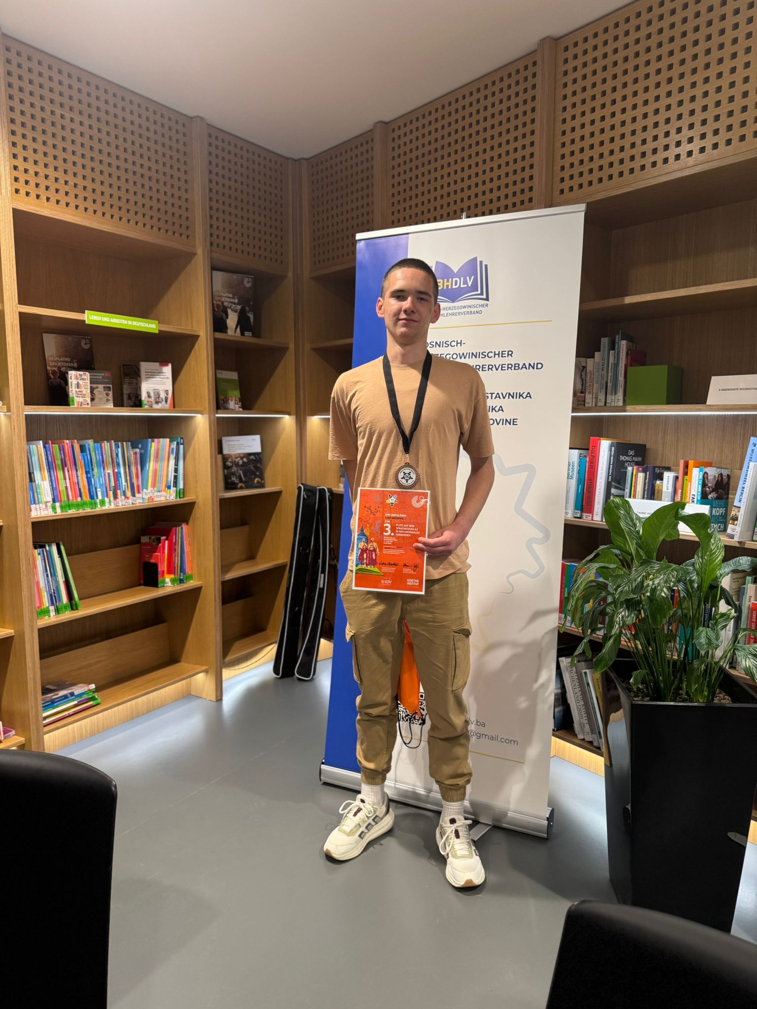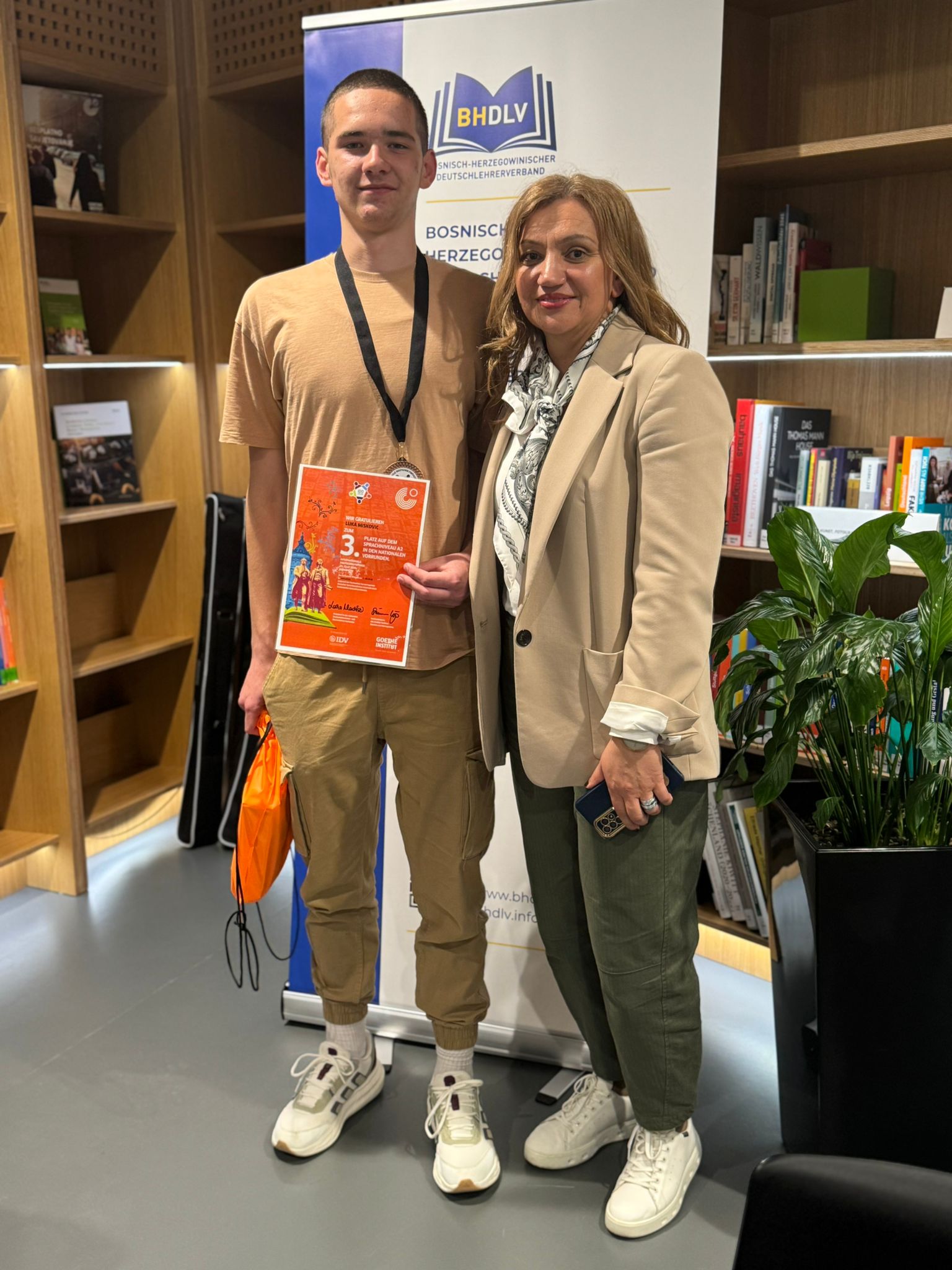 Samo dan kasnije, 17. travnja, Luka je ostvario još jedan zapažen uspjeh – na završnom natjecanju iz njemačkog jezika, Finale Deutscholympiade,održanom u Goethe-Institutu u Sarajevu, osvojio je izvrsno treće mjesto na razini A2. Pod mentorstvom profesorice Marije Papić, Luka je pokazao iznimno znanje, predanost i ljubav prema njemačkom jeziku.