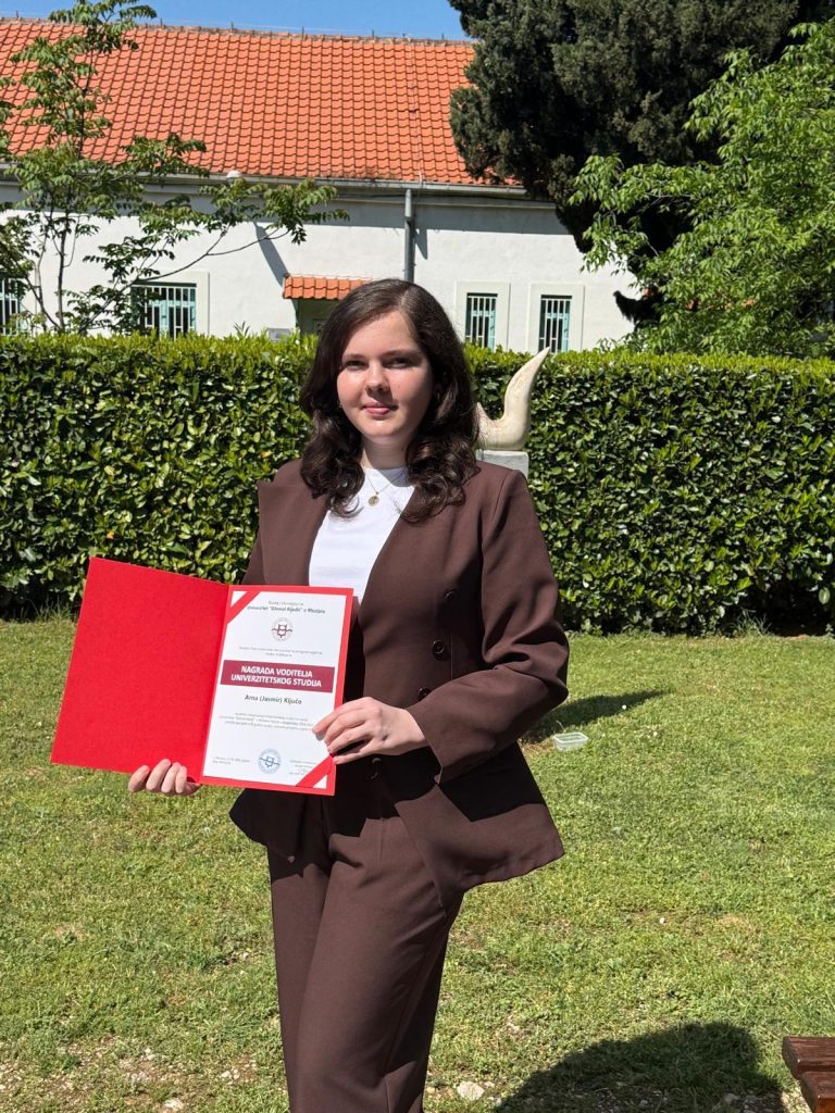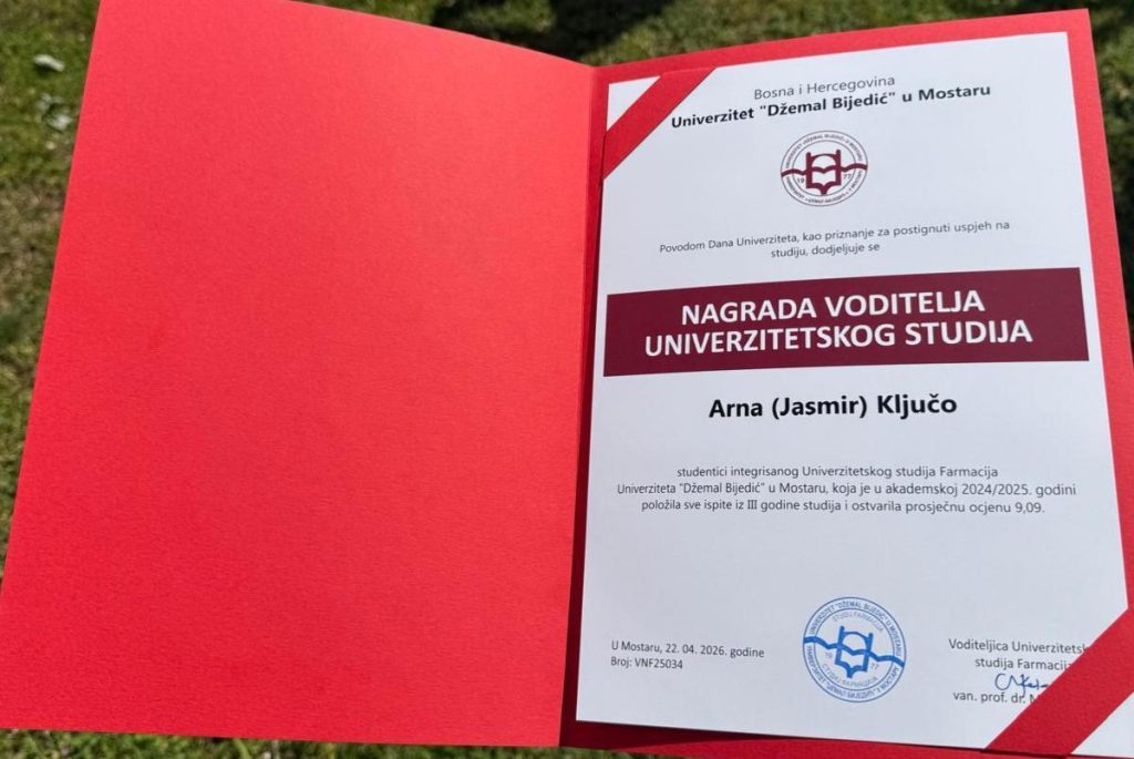 Na svečanosti povodom Dana Univerziteta Džemal Bijedić u Mostaru, studentica Farmacije Arna Ključo, bivša učenica Gimnazije Livno ponovno je nagrađena nagradom voditelja univerzitetskog studija za izniman uspjeh. U akademskoj 2024./2025. godini uspješno je položila sve ispite treće godine te ostvarila prosjek ocjena 9,09.